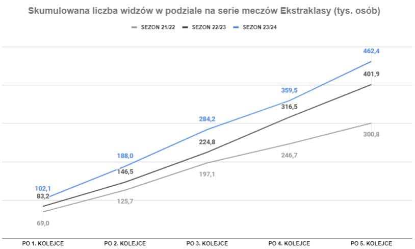 Jak dotąd w pięciu kolejkach na stadionach pojawiło się 462 tys. osób, czyli zdecydowanie więcej niż w poprzednich dwóch sezonach. W porównaniu do ubiegłorocznych rozgrywek wzrost wynosi 60 tys. kibiców, czyli ponad 15%. Względem sezonu 2021/22 mówimy o wzroście w wysokości aż 54%. Oczywiście należy pamiętać o przełożonych meczach, które miały miejsce także w poprzednich sezonach. Gdyby mecze rozgrywano zgodnie z harmonogramem mielibyśmy już ponad pół miliona widzów na stadionach.