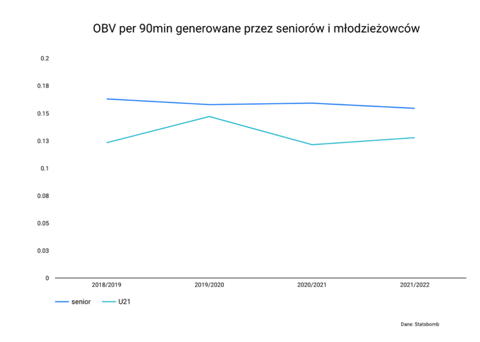 Tych wątpliwości nie rozwiewa wykres, którym kiedyś na łamach serwisu Transfery.info podzielił się Paweł Kapuściński, analityk Rakowa Częstochowa. Wynika z niego dość jednoznacznie, że w analizowanym okresie młodzieżowcy w Ekstraklasie odstawali od seniorów pod względem wpływu na grę zespołu. O tym mówi metryka OBV, która mierzy pod kątem prawdopodobieństwa strzelenia bramki każde zagranie w meczu.