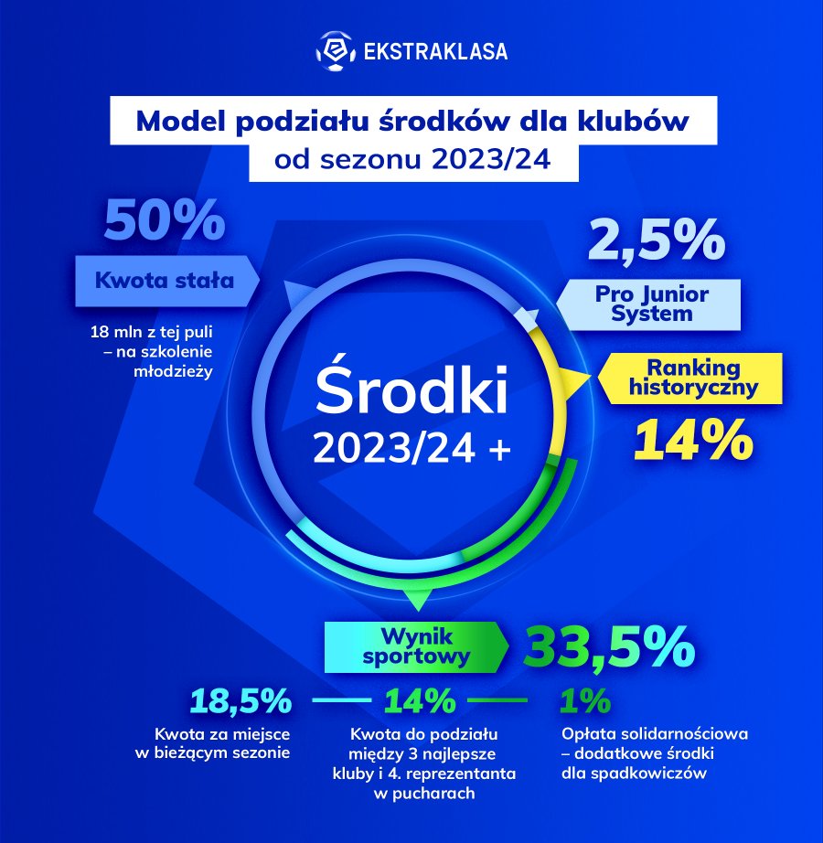 - Pozostałe 2.5% to nagrody wypłacane w ramach Pro Junior System. Tutaj należy pamiętać, że jeśli zespół spadnie z ligi, otrzymuje jedynie połowę środków z PJS, a druga część trafia do Fundacji Ekstraklasy.