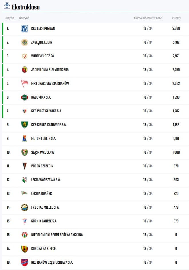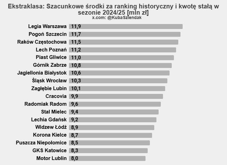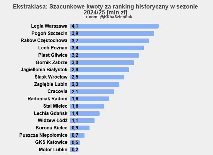 Zgodnie z harmonogramem wypłat, do klubów trafiły już dwie transze – obie na połowę kwoty stałej, która w poprzednim sezonie wyniosła dokładnie 7.878.965 zł. W styczniu zostanie rozliczony ranking historyczny, który wygląda następująco: