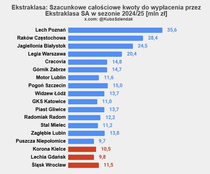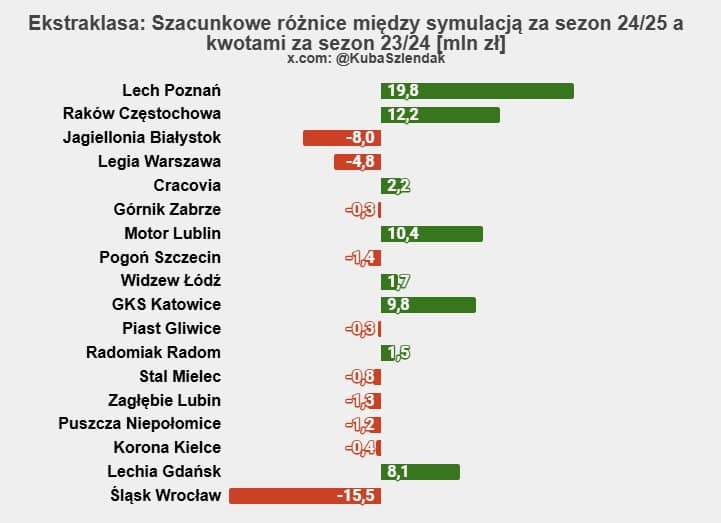 Największe dodatnie różnice w stosunku do poprzedniego sezonu zanotuje (oprócz beniaminków) wspomniany już Lech Poznań i Raków Częstochowa. Z kolei z największym deficytem budżetowym będzie musiał zmierzyć się Śląsk Wrocław, który oprócz oczywistych konsekwencji spadku do niższej ligi otrzyma z Ekstraklasy o 15.5 mln zł mniej niż w sezonie 2023/24. Rok temu wrocławianie zdobyli wicemistrzostwo Polski, co wiązało się z wysokimi środkami od spółki zarządzającej ligą oraz startem w eliminacjach Ligi Konferencji Europy.
