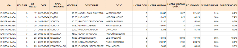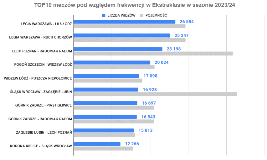 Świetne wyniki widzimy w Krakowie, gdzie zarówno frekwencja, jak i procent wypełnienia były wysokie. W dalszej kolejności mamy mniejsze stadiony lub takie z ograniczoną liczbą miejsc (jak w Płocku).
