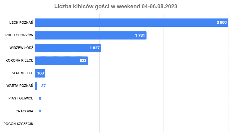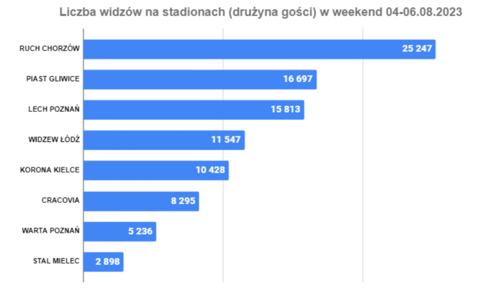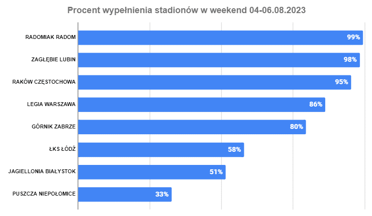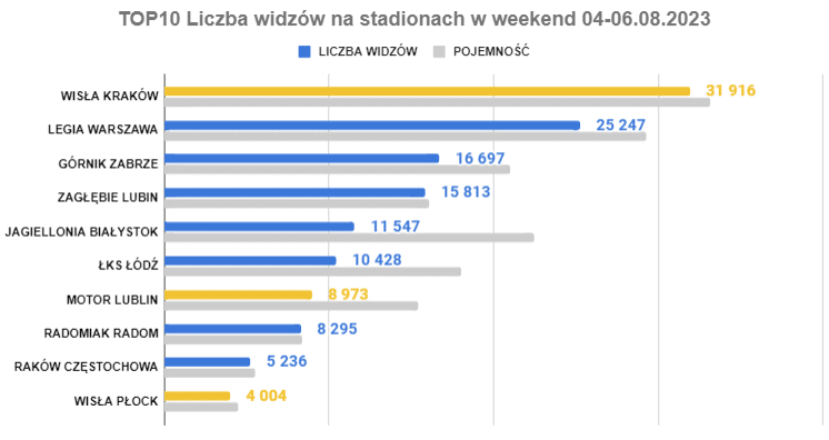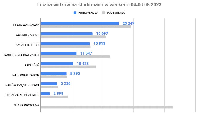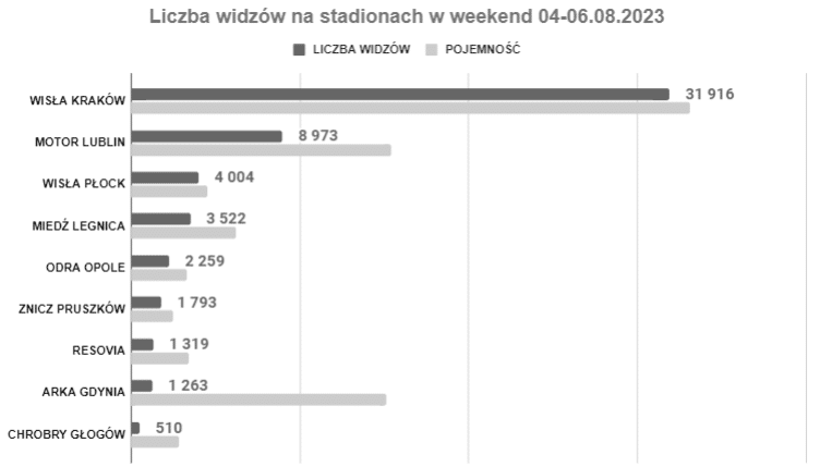 Najlepszym wynikiem może pochwalić się Legia, która podejmowała Ruch Chorzów, czyli jeden z najbardziej utytułowanych klubów piłkarskich w kraju. Najgorszy wynik odnotowano w Krakowie, gdzie mecze domowe rozgrywa póki co Puszcza Niepołomice. Pojemność stadionu na ich meczach wynosi 8 900. Na meczu Jagiellonii pierwszy raz w tym sezonie było więcej niż 10 tys. widzów (na poprzednim meczu z Puszczą było niecałe 8.5 tys.). Granicę tę przekroczyli także kibice ŁKS-u Łódź, którzy w ostatni weekend zainaugurowali sezon na swoim stadionie. Standardowo na meczu Rakowa było ponad 5 tys. osób, więc wolne zostały pojedyncze krzesełka. W Zabrzu mieliśmy drugi raz z rzędu w tym sezonie ponad 16 tys. widzów, a inauguracja nowego stadionu Radomiaka (jeszcze nieukończonego w całości) przyciągnęła maksymalną liczbę kibiców. Rekord nowego stadionu ustanowiło Zagłębie Lubin, które zanotowało frekwencję na poziomie prawie 16 tys. widzów, czyli najlepszą od 13 lat.