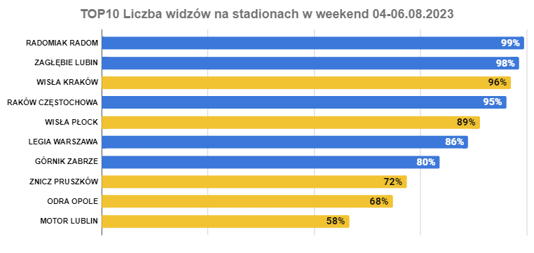 Pod względem zapełnienia obiektów dwa czołowe miejsca należą do klubów Ekstraklasy: Radomiaka i Zagłębia. Następnie mamy pierwszoligową Wisłę Kraków i mistrzów Polski – Raków. Zestawienie zamykają trzy zespoły z zaplecza Ekstraklasy. Tym razem do znalezienia się w TOP10 potrzebne 58% zapełnienia trybun.