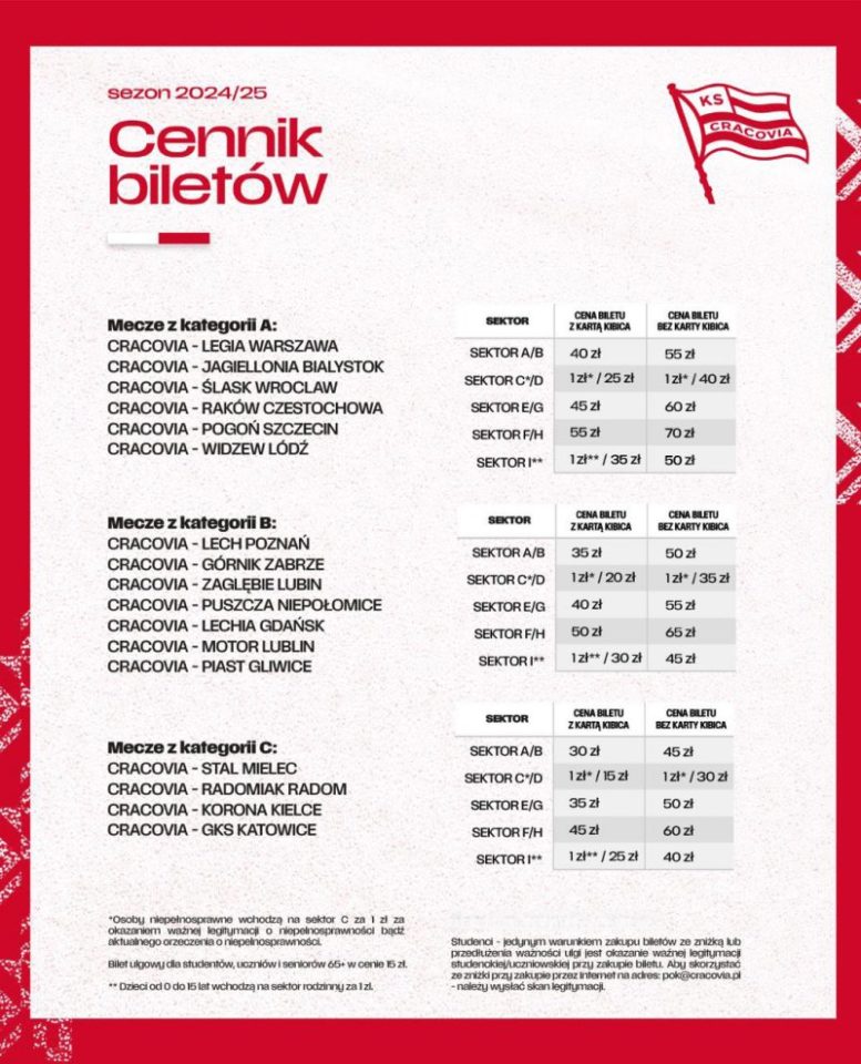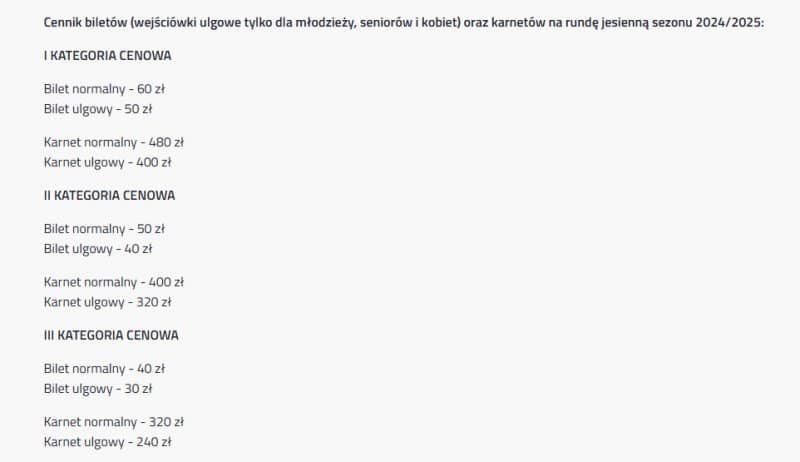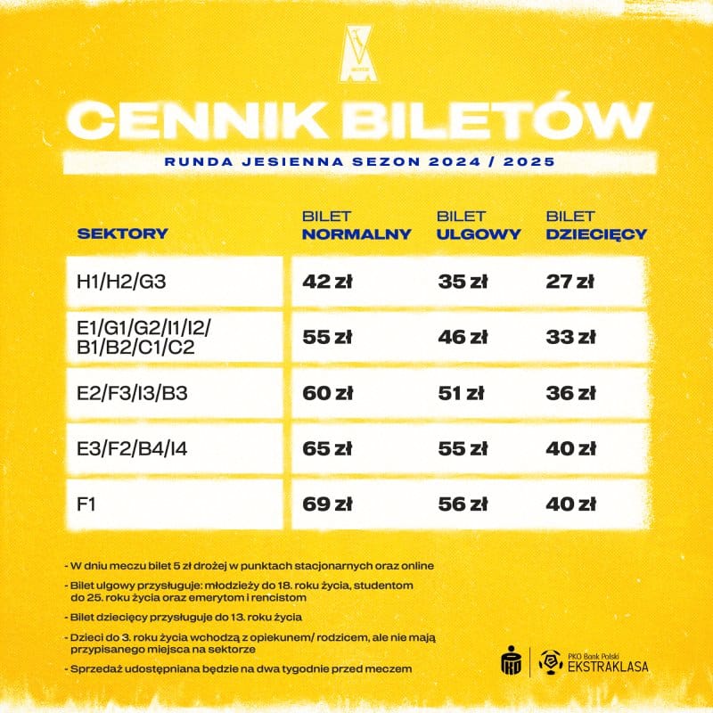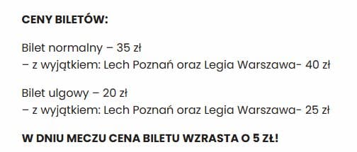 Klub zaznacza, że nie wszystkie sektory są dostępne na każdym meczu. To zależy od planowanej frekwencji i decyzji organizatorów. Ponadto ceny biletów rosną o 5 zł na 48 godzin przed meczem (nikt w Ekstraklasie nie stosuje godzinowego naliczania), a do sprzedaży online doliczana jest opłata transakcyjna w wysokości 1.5 zł (tego też nikt w Ekstraklasie nie robi).