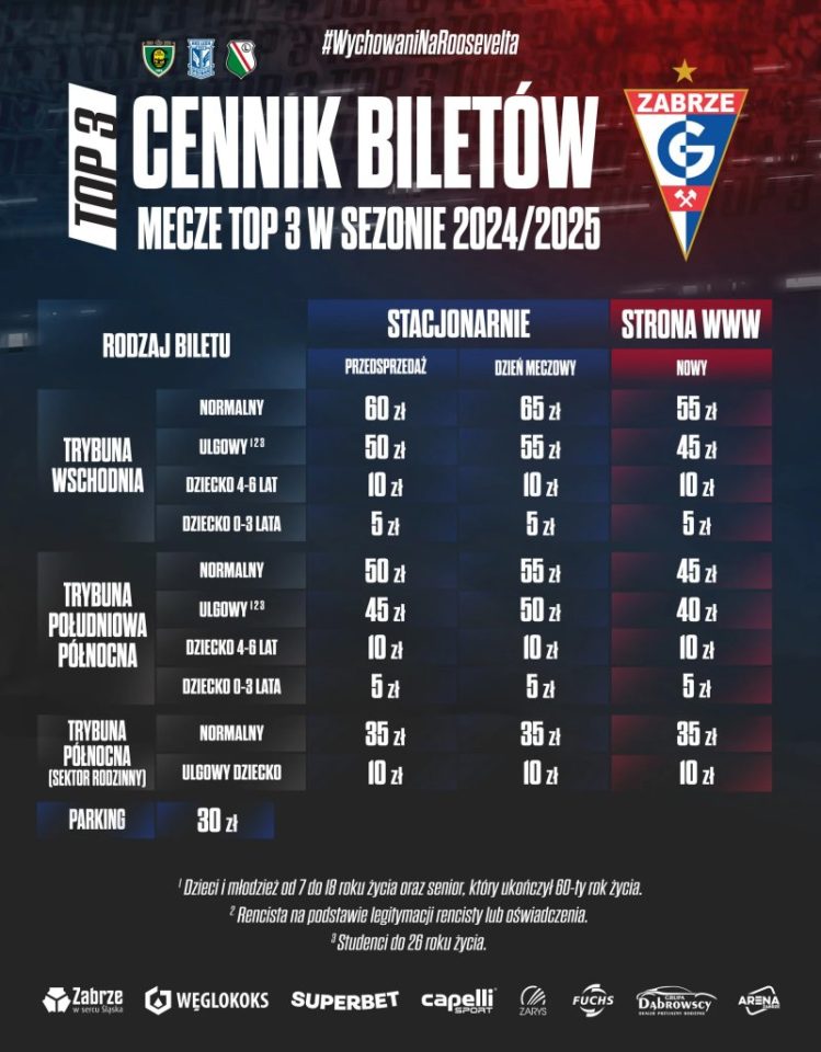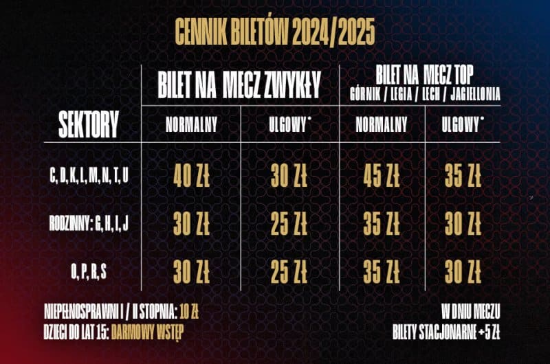 W Zabrzu cennik jest bardziej skomplikowany. Mecz z Lechem Poznań jest zakwalifikowany do grupy meczów TOP3 i jego cena dla dorosłych jest droższa o 5 zł. Poza tym cena różni się w grupach wiekowych, trybunach, stacjonarnie przed dniem meczu zapłacimy o 5 zł mniej (inaczej mówiąc w dniu meczu jest o 5 zł drożej). Kupując online oszczędzamy po 5 zł na sztuce.
