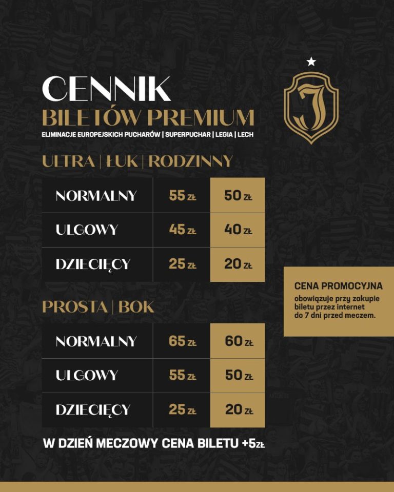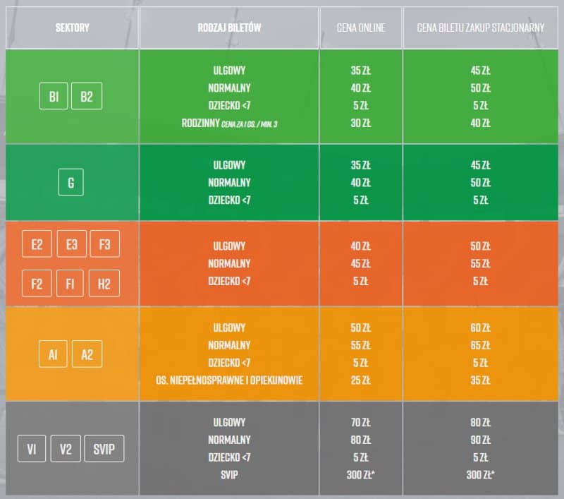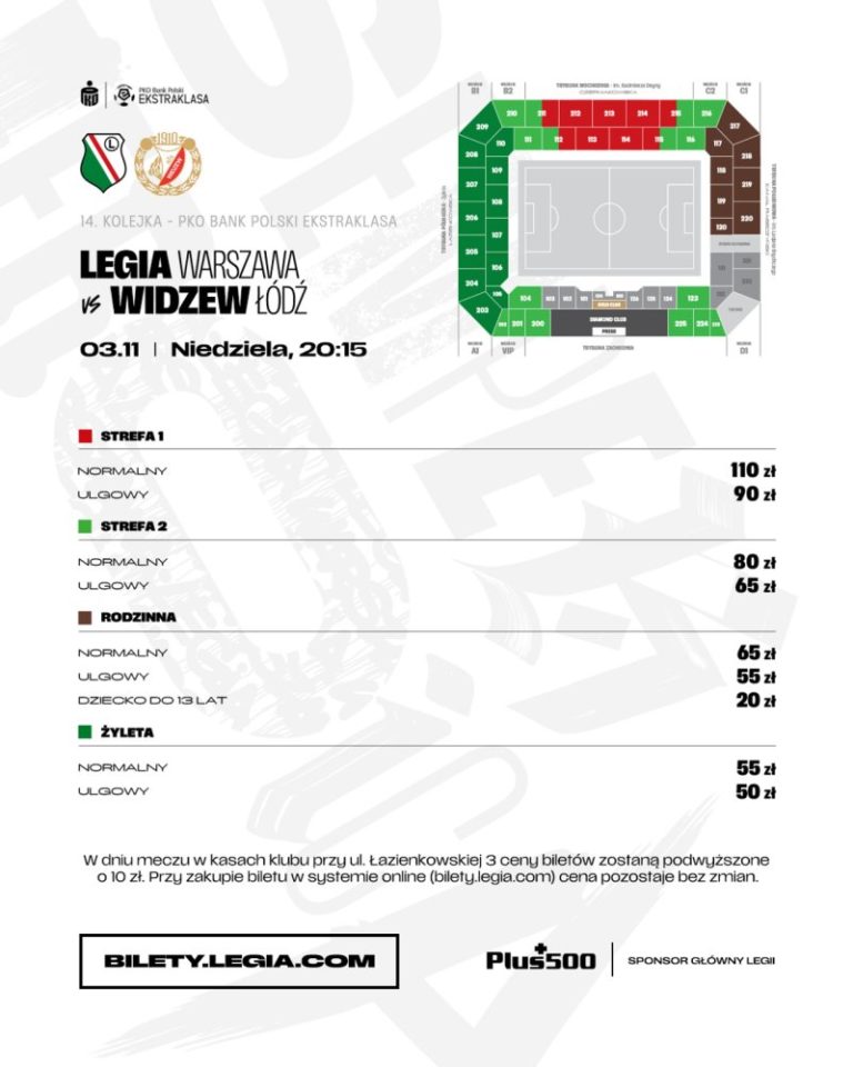 W dniu meczu bilety sprzedawane stacjonarnie są droższe o 10 zł, ale cena online nie zmienia się.Warto zauważyć, że cennik biletów na mecze Legionistów jest bardzo czytelny i na grafice od razu widzimy schemat stadionu (oprócz nich tylko Raków robi to w ten sposób). Strefy cenowe są oznaczone kolorami, co ułatwia wybór interesującego nas wariantu. Gdyby inne kluby zainspirowały się tym pomysłem, łatwiej byłoby mniej zaangażowanym kibicom kupić bilet.