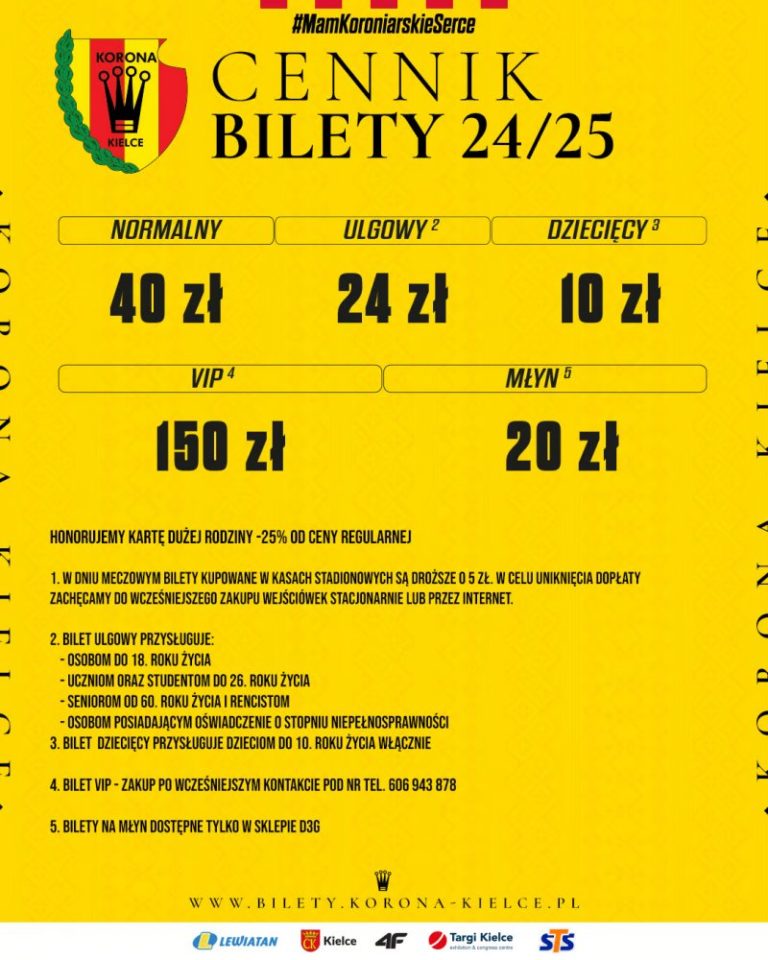 Kupując bilety w dniu meczu stacjonarnie na dowolny mecz Korony rodzina 2+1 zapłaci 105 zł, a wcześniej oraz online 90 zł.