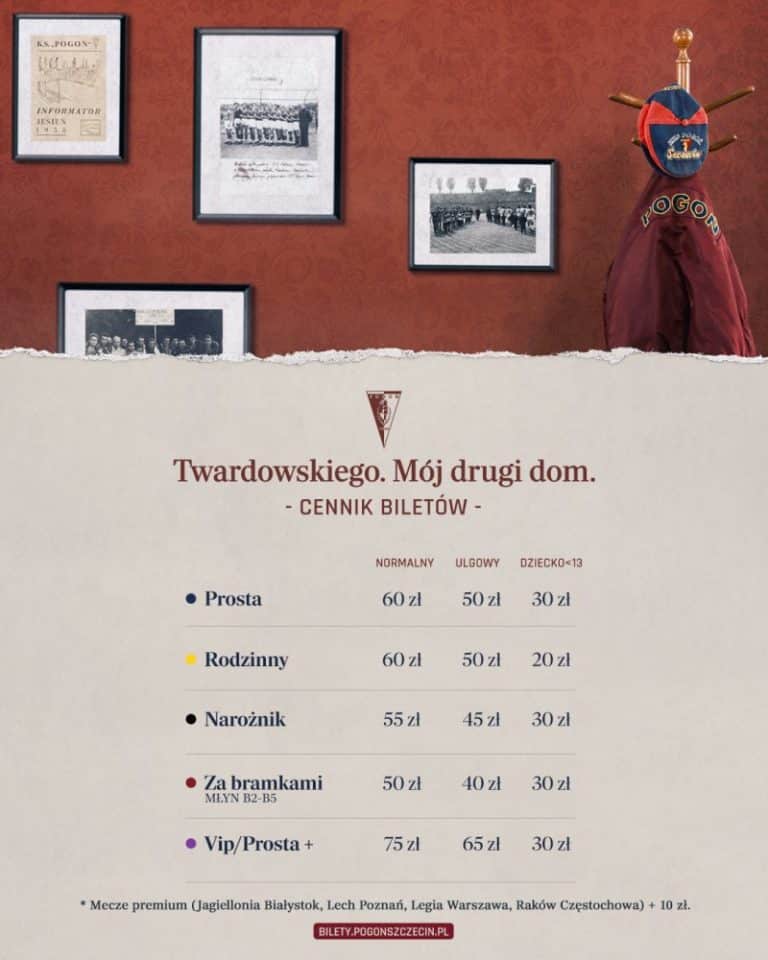 Kibice Pogoni, którzy chcą przyjść na mecz z Lechem Poznań zapłacą więcej o 10 zł, bo jest to spotkanie kategorii “premium”. Za bilety dla rodziców zapłacimy łącznie 130 zł, bo kobiety mogą skorzystać z taryfy ulgowej. Bilet dla dziecka poniżej 13 r.ż. to koszt 30 zł.