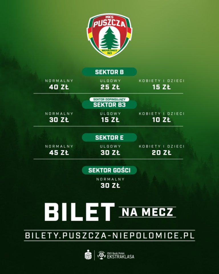 Puszcza rozgrywa swoje domowe mecze na stadionie Cracovii przy ul. Kałuży w Krakowie. Za bilety na sektor B zapłacimy 40 zł za wejściówkę dla mężczyzny oraz po 15 zł za bilety dla kobiety i dziecka, które ukończyło 5 lat. W dniu meczu cena biletów rośnie o 5 zł (także online). Klub nie przedstawia różnych cen w zależności od klasy rywala.
