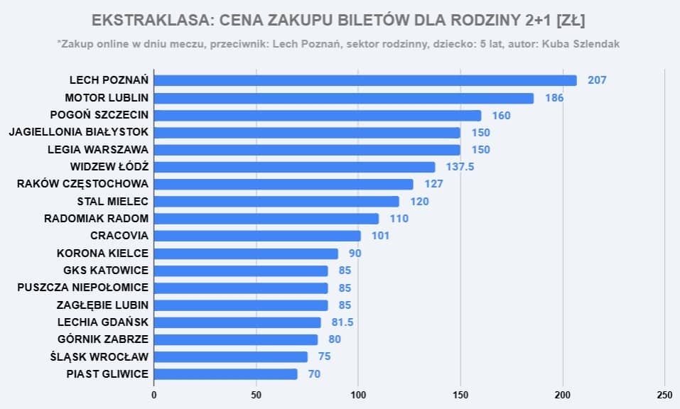 Średnia cena wynosi 118 zł. Poniżej 100 zł trzeba zapłacić za bilety na mecze 8 drużyn, od 100 zł do 150 zł na wejściówki na mecze kolejnych 7 zespołów, a powyżej 150 zł zapłacimy za mecz Motoru i Pogoni. Tylko wejściówki na mecze Lecha przekroczyły granicę 200 zł.