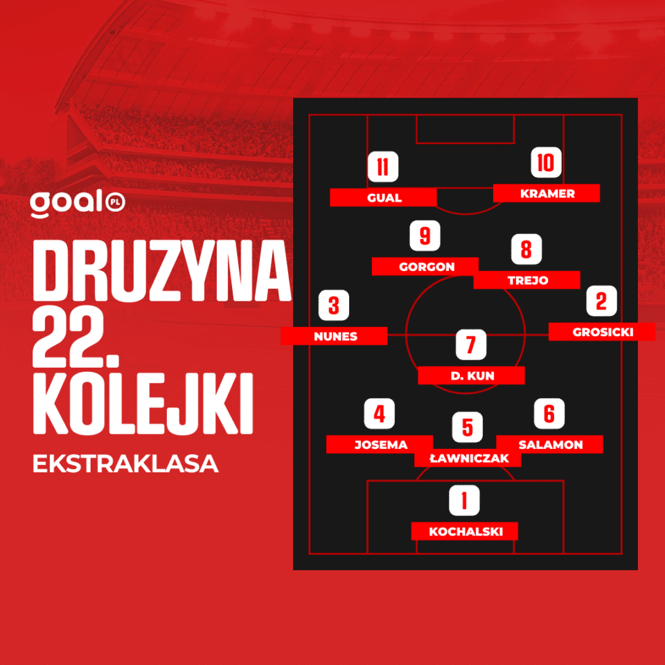 Dobry powrót do gry zalicza Salamon, który wydatnie pomógł Lechowi w zatrzymywaniu kontr Śląska. Na plus Ławniczak, który do dobrej gry dorzucił gola. Nieźle do ligi wprowadził się Josema – z nim na boisku Ruch gola w tej rundzie jeszcze nie stracił. W linii pomocy bogactwo widzewiaków – jest bardzo pewny Kun, na wahadle Nunes, a przecież mógł znaleźć się tutaj też Klimek. Na jego pozycji jednak wystawiamy Grosickiego, który według Transfermarktu dołączył do ekskluzywnego grona zawodników, którzy w ostatnich latach zaliczyli double&double goli i asyst. Super-zmiennik Gorgon z dwoma golami musi być w takim zestawieniu, podobnie jak Gual (najlepszy ligowy mecz w barwach Legii) i Kramer. Z żal na ławce zostawiamy wobec tego Szczepana, który otarł się o podwójną nagrodę za dwa najładniejsze gole kolejki.