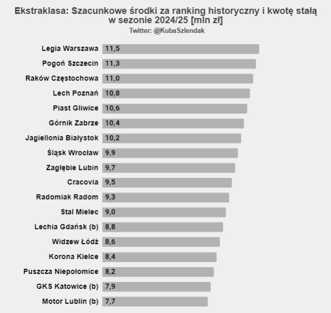 - 50% (wcześniej 44%) to kwota równo dzielona na każdy z 18 zespołów, jest to tak zwana “kwota stała”, w tym sezonie wyniesie ok. 7.5 mln zł