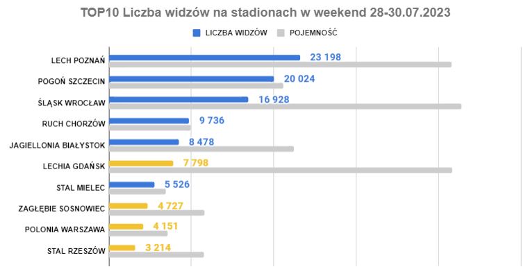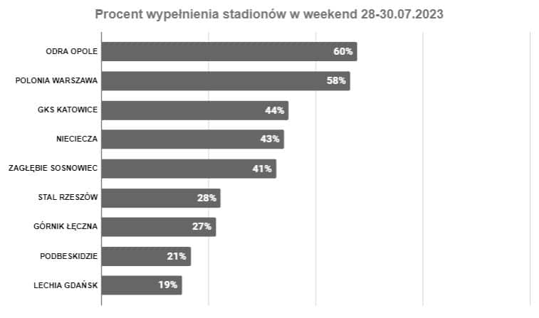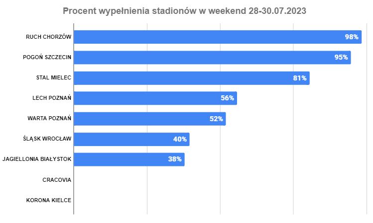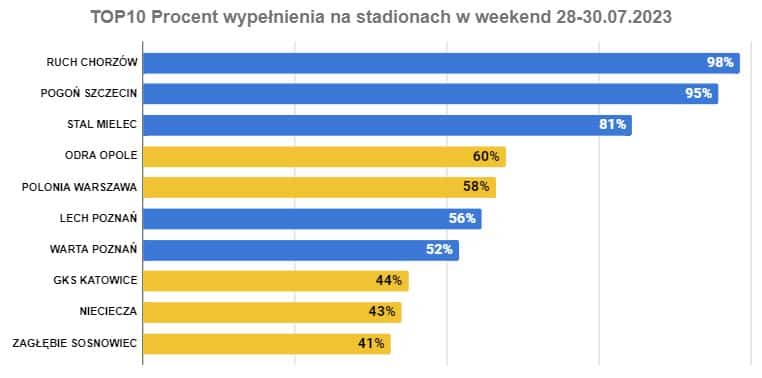 Pod względem zapełnienia obiektów trzy czołowe miejsca należą do klubów Ekstraklasy: Ruchu, Pogoni i Stali. Następnie mamy pierwszoligową Odrę Opole i Polonię Warszawa. Tym razem do TOP10 wystarczyło jedynie 41% zapełnienia trybun. W poprzedni weekend było to 62%.