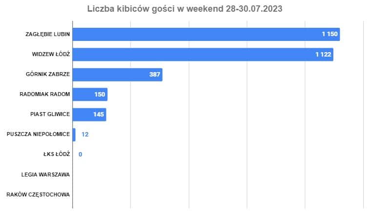 Poniższy wykres to odpowiedź na pytanie: “Ilu kibiców gości było na stadionach?”. Najwięcej fanów pojechało na dość bliski mecz derbowy Zagłębia Lubin. Niewiele mniej kibiców wybrało się w podróż z Łodzi do Szczecina. Symboliczne 12 osób pojechało dopingować piłkarzy Puszczy Niepołomice do dalekiego Białegostoku (ponad 1 000 km w dwie strony).