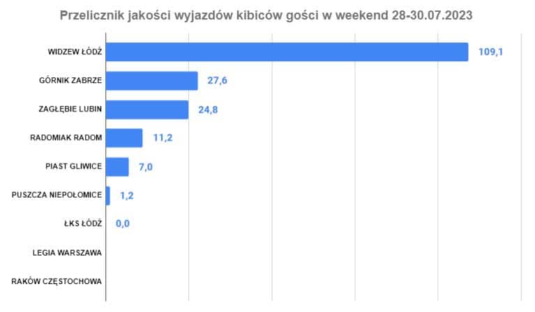 Kibice Zagłębie i Widzewa mogą pochwalić się bardzo dobrym wynikiem wyjazdowym, ale z uwagi na duże frekwencje wśród fanów gospodarzy stanowili mniej niż 7% ogółu widzów.