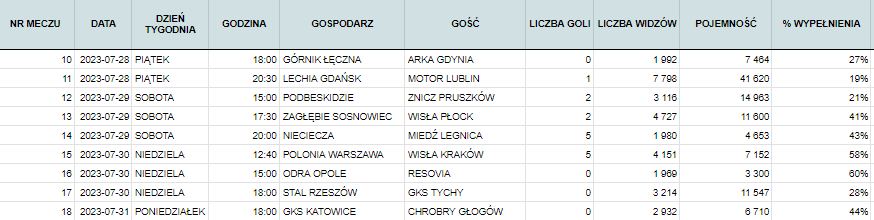 Poza stadionami we Wrocławiu i Białymstoku, na każdym stadionie frekwencja przekroczyła połowę ich pojemności. Tym razem na dwóch arenach mieliśmy co najmniej 95% maksymalnej liczby widzów, w Mielcu ponad 80%, a na meczach Lecha i Warty odpowiednio 56% i 52%.