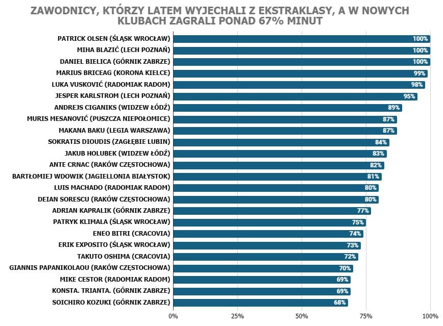 Kiedy chcemy sprawdzić czy zawodnicy, którzy wyjechali z Ekstraklasy poradzili sobie w nowym miejscu chyba najlepszym wskaźnikiem będzie procent rozegranych minut w lidze krajowej. Idąc tym torem, tylko trzech zawodników grało od deski do deski (Olsen, Blazić i Bielica). Dokładnie co trzeci zawodnik spędził na boisku co najmniej 2/3 możliwych minut. Z drugiej strony, co czwarty nie rozegrał nawet 25% minut.