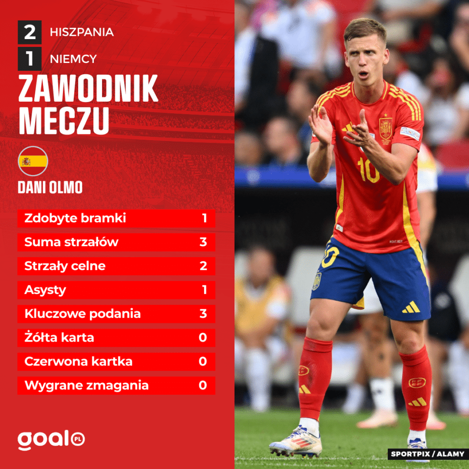 Dani Olmo ponadto oddał trzy strzały na bramkę Manuela Neuera. Dwa z nich były celne, w tym jeden znalazł drogę do bramki. Hiszpański pomocnik zaliczył również trzy kluczowe podania, a po jednym z nich padł gol. Pomocnik RB Lipska zatem zasłużenie został wybrany najlepszym zawodnikiem rywalizacji przeciwko Niemcom.