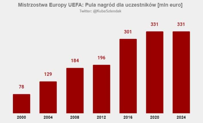 W związku z rosnącym rynkiem praw telewizyjnych, ale nie tylko pula nagród dla uczestników Euro mocno wzrosła w porównaniu z danymi sprzed dekady i dwóch. Średnio z turnieju na turniej stawki rosły aż o 35%, a tegoroczny turniej jest pierwszym od dekad, w którym pula nagród nie wzrosła. W porównaniu do naszego debiutu w finałach z 2008 roku, pula nagród wzrosła o 147 mln euro, czyli o 80%, a w porównaniu do polsko-ukraińskiego turnieju o 135 mln euro, czyli o 70%.