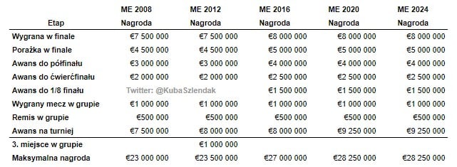 Choć sama kwota w ujęciu nominalnym niewiele się zmieniła na przestrzeni lat, to w porównaniu np. do średniej pensji w naszym kraju są to zupełnie inne kwoty. W 2008 roku, premia za sam udział w turnieju, którą dostał PZPN miała równowartość ponad 900 średnich pensji w Polsce, a w tym roku ten wskaźnik wyniesie 400. Równie mocno zmienił się udział premii za udział w turnieju w budżecie PZPN, który zmalał z ok. 50% do 10-15%.