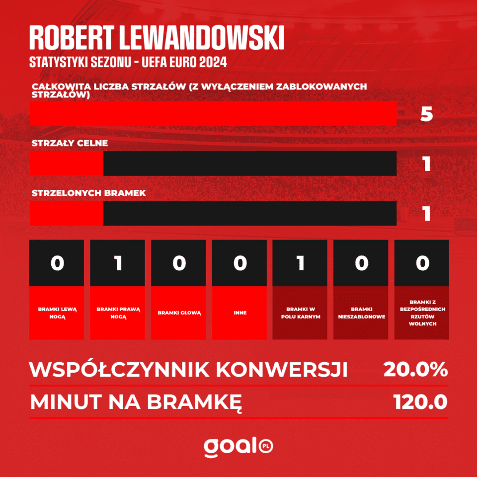 Lewandowski podczas gry na Euro 2024 wystąpił w dwóch meczach. W spotkaniu z Austrią wszedł na murawę w 60. minucie gry, zaś w starciu z Francją rozegrał pełne dziewięćdziesiąt minut. Jedyną bramkę na turnieju strzelił właśnie w rywalizacji z Les Bleus, gdy wykorzystał powtórzony rzut karny po błędzie Mike’a Maignana, który nie miał kontaktu z linią bramkową przy uderzeniu Polaka.