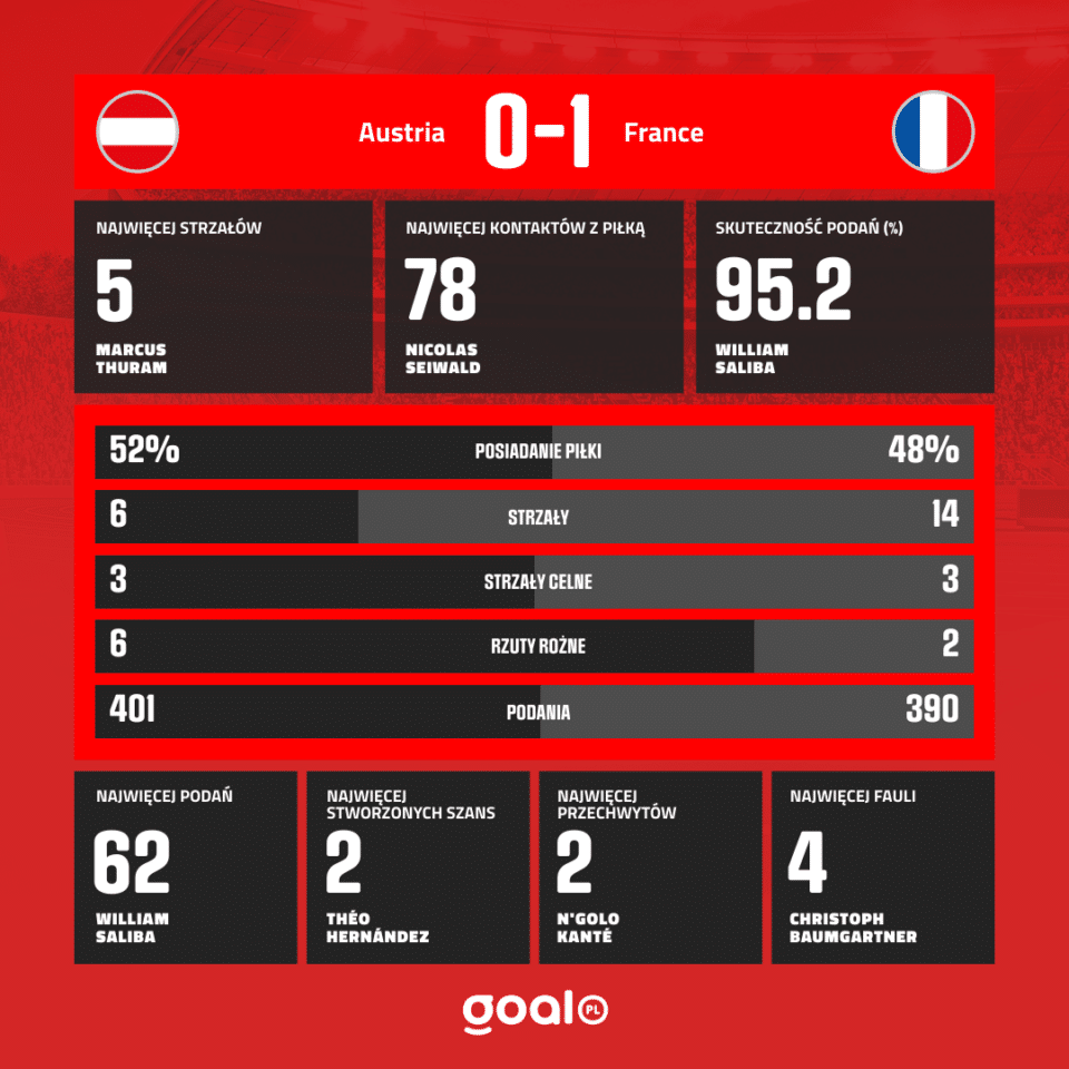 Choć ten fakt może dziwić, to Austria miała większe posiadanie piłki w meczu z Francją. Podopieczni Ralfa Rangnicka wykonali również więcej podań oraz mieli więcej rzutów rożnych.