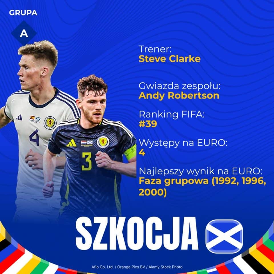 Reprezentacja Szkocji trafiła do grupy A, gdzie niezwykle trudno wytypować drużynę, która obok Niemców wywalczy awans z pierwszej dwójki. Na papierze najmocniejsza, oprócz oczywiście gospodarza mistrzostw Europy, zdaje się być Szwajcaria, jednak stale rozwijające się Węgry zapragną pokrzyżować jej plany. Jakie upatruje się więc szanse Szkotów? Bez wątpienia czeka ich bardzo wymagające wyzwanie. Wystąpią w meczu otwarcia przeciwko reprezentacji Niemiec, która jest niezwykle zdeterminowana, aby wreszcie ukoić nienasycone serca swoich kibiców. Ten mecz może zakończyć się wysoką porażką Wyspiarzy, a wówczas konieczne będzie zapunktowanie w następnych dwóch kolejkach fazy grupowej. Koniec końców wydaje się jednak, że spośród wszystkich czterech drużyn grupy A, Szkocja jest tą o najmniejszym potencjale. Czwarty turniej, czwarty raz bida z nędzą. To scenariusz najbardziej prawdopodobny, choć… Szkoci nie byli też typowani do rozklepania grupy eliminacyjnej, a jednak – skończyli fazę eliminacji z 6 punktami więcej niż Norwegia.