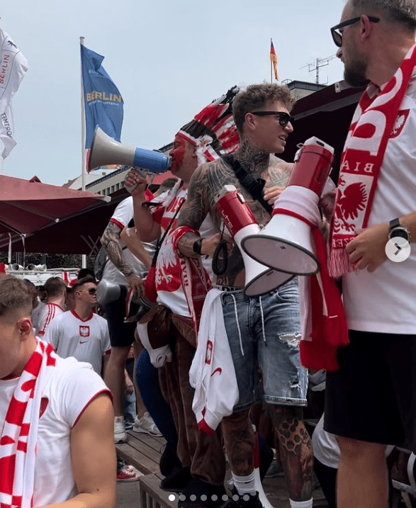 Mateusz Pilecki (bez koszulki) podczas zgromadzenia polskich kibiców w Berlinie przed meczem Polska – Austria na Euro 2024 (fot. Instagram Mateusza Pileckiego)