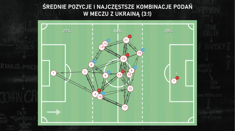 Probierz ma z kogo wybierać. Dla stabilizacji wskaże na pomocnika o bardziej defensywnych inklinacjach – Bartosza Slisza lub Tarasa Romanczuka – ale im wyżej, tym mocniej może postawić na chęć utrzymania się przy piłce. To być może najważniejsze wnioski ze sparingowego dwumeczu z Ukrainą i Turcją: umieszczenie nawet czterech piłkarzy uchodzących za rozgrywających da efekt w postaci komfortowego rozegrania. Nie zawsze, ale i tak częściej, niż polski kibic do tego przywykł. Posiadanie piłki w meczu z Ukrainą było na korzyść rywali (43-57), ale w liczbie akcji długich, przynajmniej 45-sekundowych wynik był podobny (6-7). Dokładność zagrań Polaków wyniosła aż 85%. W spotkaniu z Turcją było bardzo podobnie – posiadanie nieznacznie wzrosło (do 45%), akcji o przynajmniej 20 sekundach było tyle samo (18).