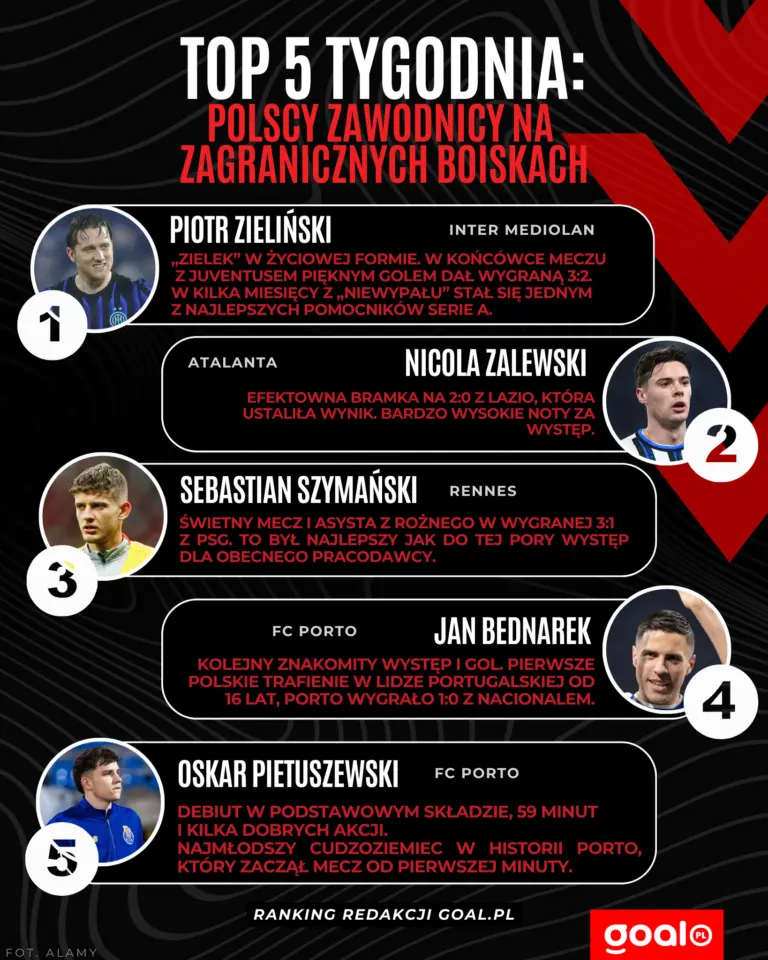 Na czoło zestawienia wysuwa się Piotr Zieliński, który rozstrzygnął hit z Juventusem. O trafieniu Polaka zrobiło się głośno w całej Europie. Wyróżnili się jednak także inni. Oto ranking TOP 5 polskich akcentów ostatniego tygodnia według redakcji Goal.pl.