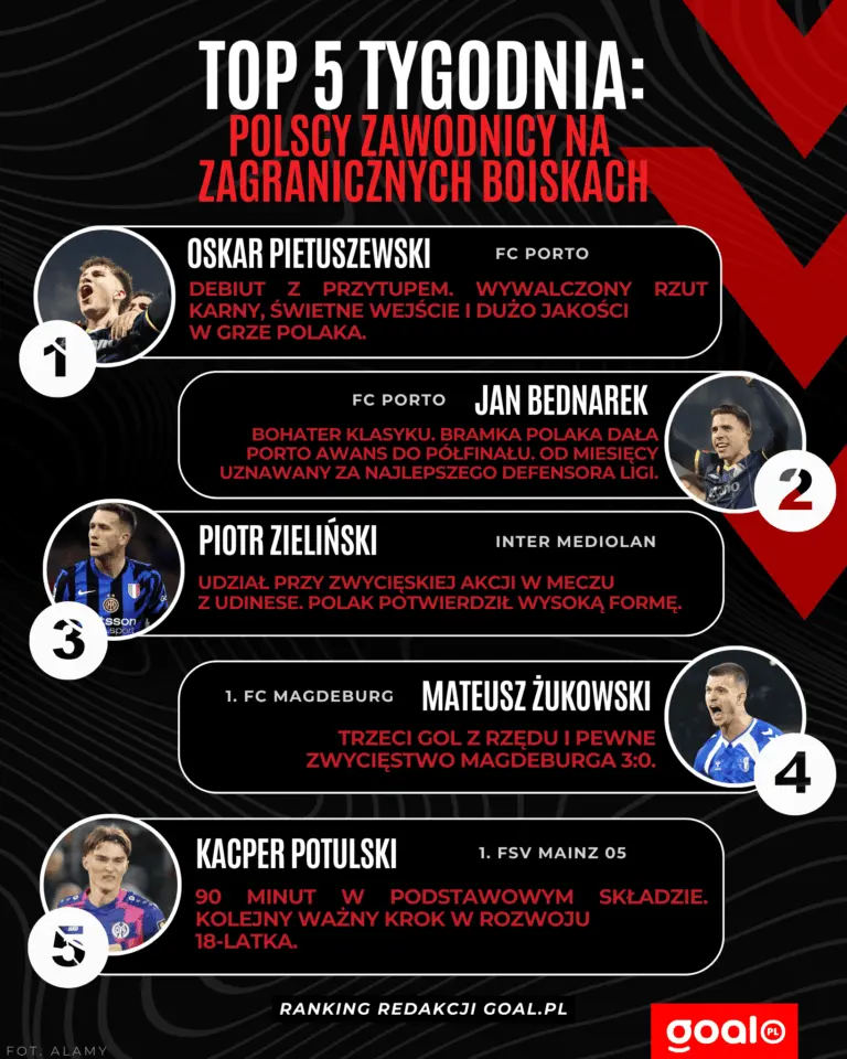 Na podstawie występów ligowych i pucharowych przygotowaliśmy nasze własne zestawienie. Oto TOP 5 Polaków tygodnia za granicą według redakcji Goal.pl. Sprawdź również ranking z poprzedniego tygodnia.