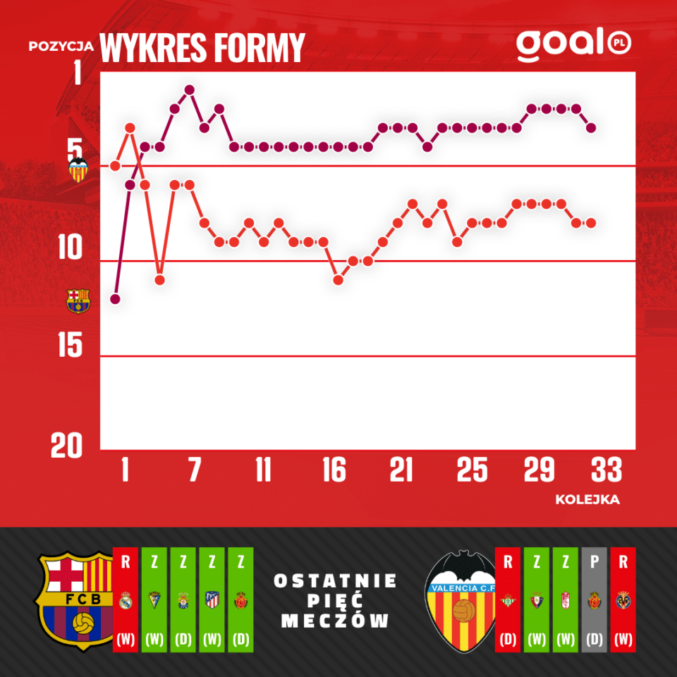 W zaplanowanym na poniedziałek ostatnim meczu 33. kolejki La Liga, FC Barcelona przed własną publicznością zmierzy się z Valencią. Duma Katalonii będzie grała w tym meczu o powrót na drugie miejsce w ligowej tabeli. Valencia liczy jednak na sprawie niespodzianki i zdobycie punktów, które przybliżą ją do występów w przyszłym sezonie w europejskich pucharach.