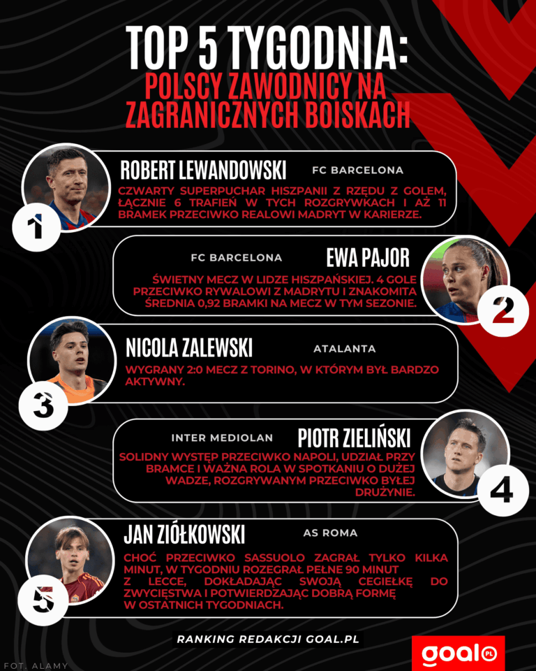 Robert Lewandowski znów udowodnił, że mecze z Realem Madryt działają na niego wyjątkowo. Wrócił do pierwszego składu Barcelony i strzelił gola w finale Superpucharu Hiszpanii, pomagając w ten sposób Blaugranie w sięgnięciu po kolejne trofeum. Dla kapitana reprezentacji Polski był to już czwarty Superpuchar z rzędu okraszony trafieniem, a łącznie ma na koncie sześć goli w tych rozgrywkach. Co więcej, w całej karierze zdobył już 11 bramek przeciwko Realowi, umacniając swoją pozycję jednego z największych „katów” Królewskich.