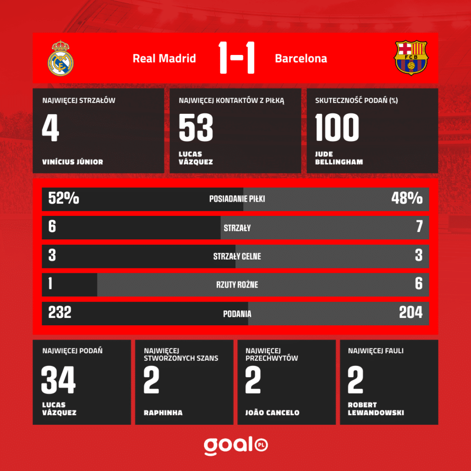 Zarówno Real, jak i Barcelona próbowały jeszcze szczęścia w pierwszej połowie, lecz więcej bramek na Estadio Santiago Bernabeu nie było. Choć jedni i drudzy mieli dogodne okazje, jak strzał Gundogana z rzutu wolnego w 45. minucie czy okazja Rodrygo w doliczonym czasie gry. Zanim sędzia odgwizdał koniec pierwszej części gry boisko z powodu kontuzji musiał opuścić Frenkie De Jong. Ostatecznie pierwsze czterdzieści pięć minut zakończyło się wynikiem 1:1.
