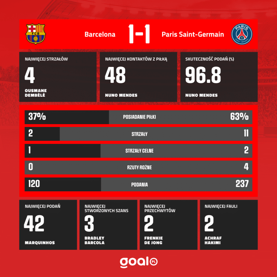 Bradley Barcola znalazł w polu karnym Dembele, który bez problemów umieścił piłkę w siatce. Goście doprowadzili do remisu na kilka minut przed przerwą.