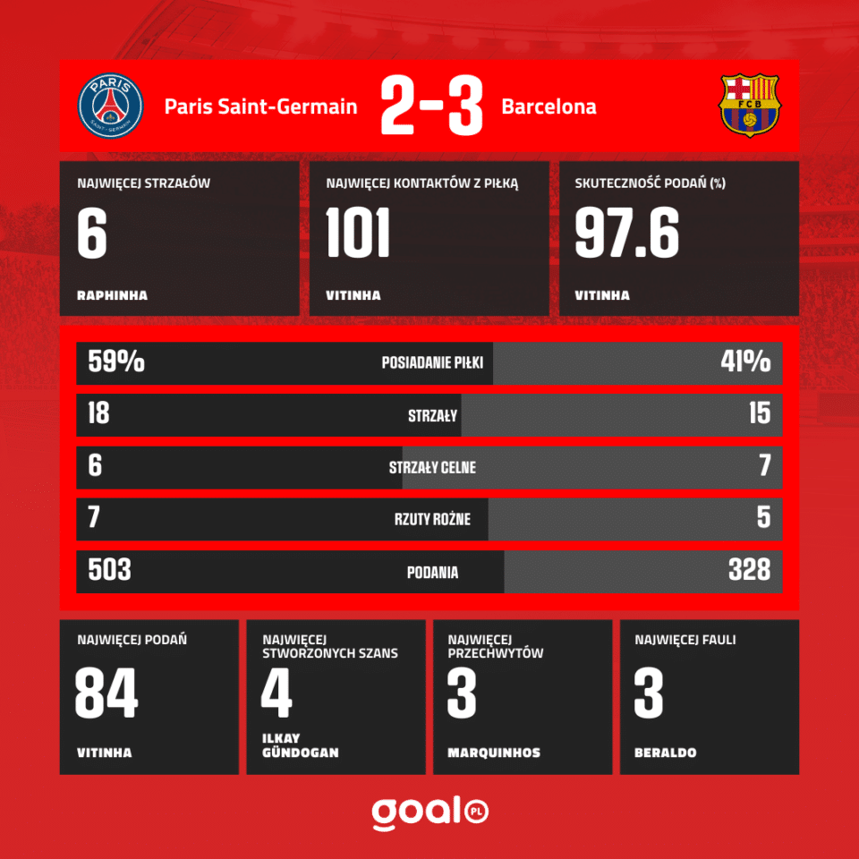 FC Barcelona wygrała 3:2 z Paris Saint-Germain w pierwszym meczu ćwierćfinałowym. Zawodnikiem meczu był Raphinha, który dwukrotnie wpisał się na listę strzelców.