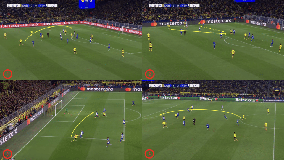 Tu najważniejsza jest różnorodność zespołu Terzicia. Najlepszy mecz w tej edycji Ligi Mistrzów rozegrali już z drużyną z Madrytu – Atletico. Wystarczy spojrzeć na decydujące zagrania, które prowadziły do gola, by zrozumieć o czym jest mowa. Dwie pierwsze bramki były efektem podań rozbijających nisko ustawioną defensywę (Atletico miało przewagę wygranej u siebie – 2:1). Jednak Borussia była to w stanie zrobić na różne sposoby: za sprawą Hummelsa wykonującego fenomenalne zagranie zewnętrzną częścią stopy (sytuacja nr 1), jak i po prostopadłym podaniu i oddaniu piłki do Iana Maatsena już w polu karnym, po zejściu z lewej strony (sytuacja nr 2). W drugiej połowie mecz stał się wyrównany, goście też skutecznie atakowali, ale Borussia miała więcej miejsca. Gdy zagrywała prostopadle, to ze środkowej strefy i to też przynosiło efekt (sytuacje nr 3 i 4).
