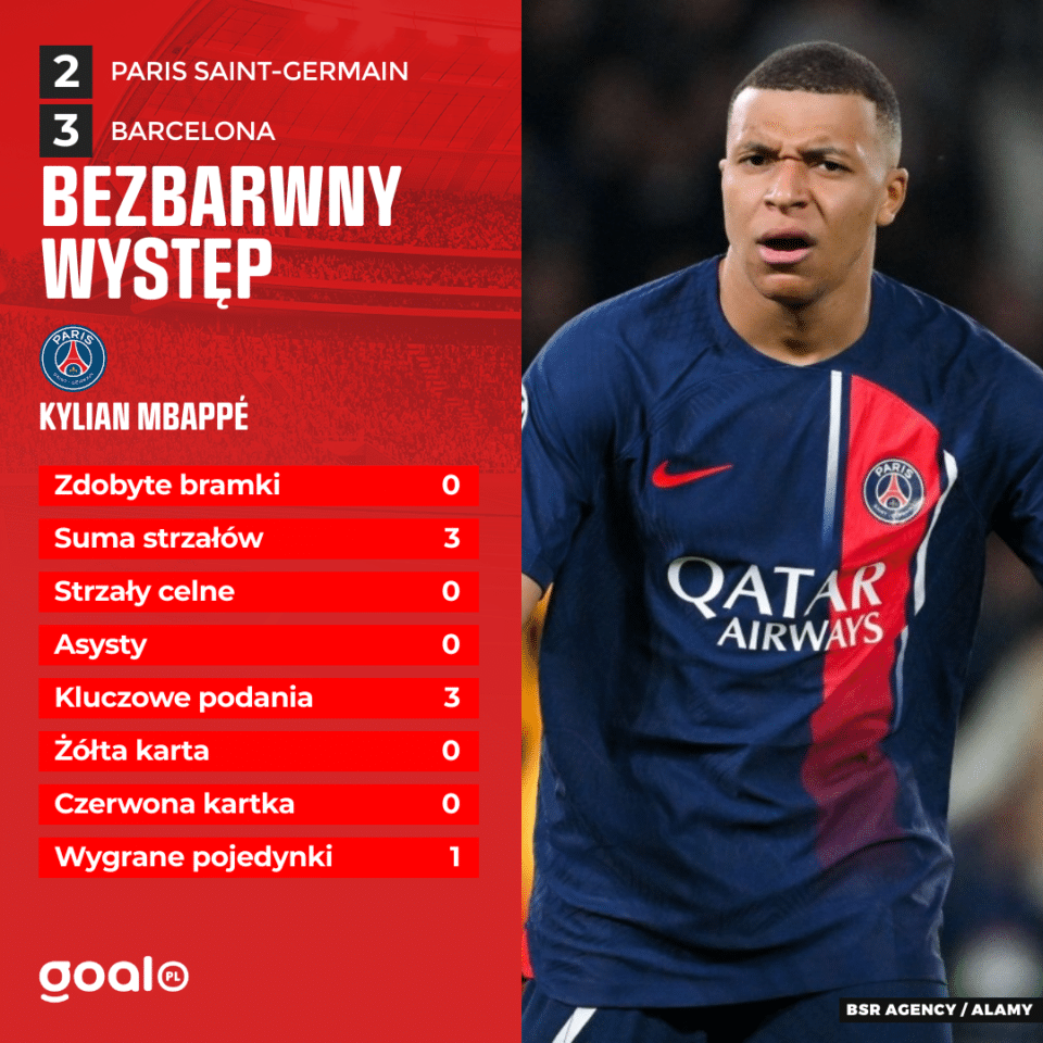 Za wyjątkiem trzech kluczowych podań w meczu Mbappe nie pokazał nic spektakularnego. Co więcej, miał łącznie tylko 44 kontakty z piłką, stracił posiadanie aż 14 razy i zaledwie dziewięć razy dotykał futbolówkę w polu karnym Barcelony. Na pięć prób dryblingu Francuz skutecznie przeprowadził tylko jeden atak. Na dodatek nie odgwizdano na nim żadnego faulu, a trzykrotnie to on dopuszczał się przewinienia w grze.