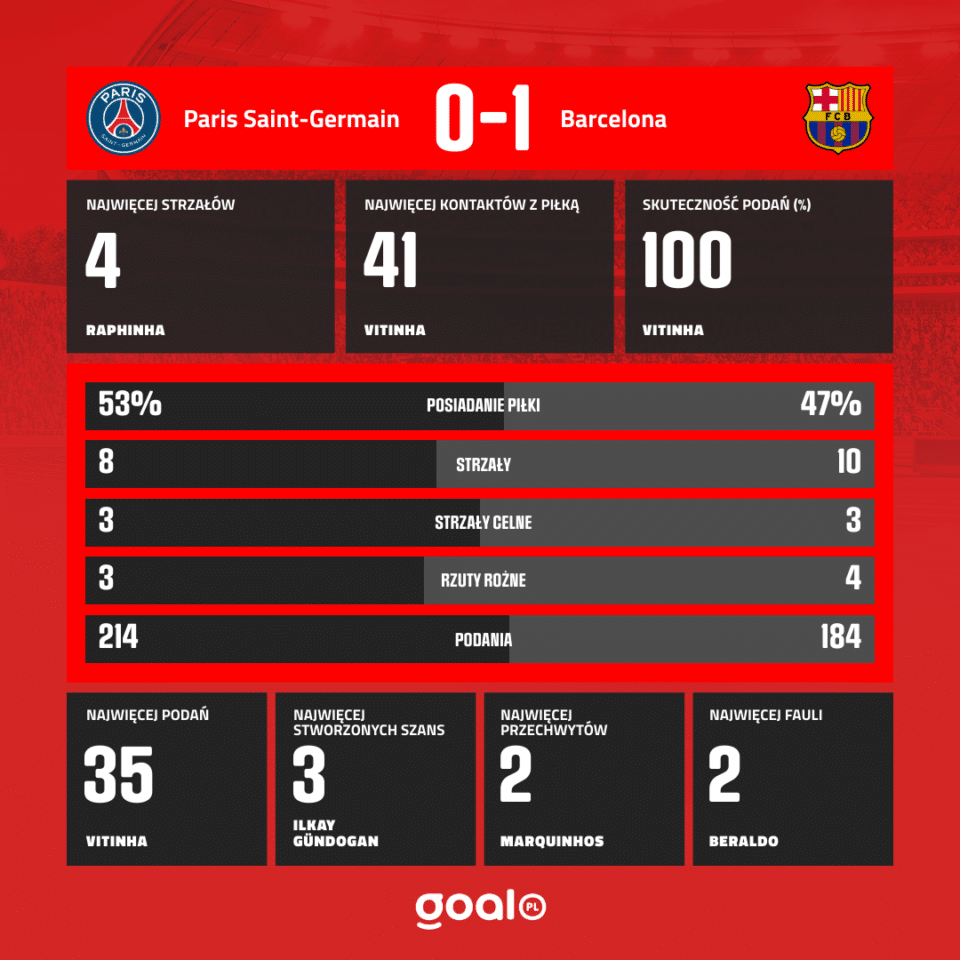 FC Barcelona blisko objęcia prowadzenia. Po dogodnej okazji Raphinhy goście otrzymali rzut rożny, Strzał głową Lamine Yamala z linii bramkowej wybili obrońcy PSG.