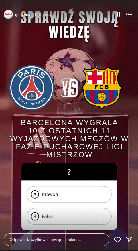 Na naszym Instagramie możecie wziąć udział w quizie na temat meczu Paris Saint-Germain – FC Barcelona. Nie zapomnijcie pochwalić się wynikiem, oznaczając nas w swojej relacji. Link do naszego Instagrama -> Goal.pl