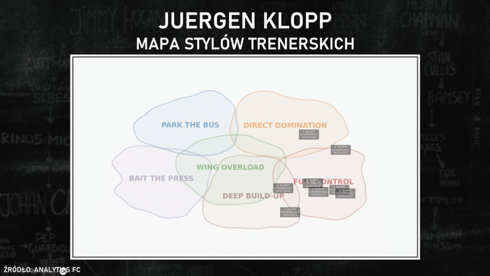 – Juergen Klopp jest fascynujący pod kątem stylu gry, ponieważ jego zespół z pierwszego sezonu jest zupełnie różny od tego obecnego. Po przeprowadzce z Dortmundu do Liverpoolu postawił na intensywność, na pressing. To oznacza, że w kolejnych latach rosło znaczenie posiadania piłki, a zmniejszała się rola bezpośredniej gry. W pierwszym jego sezonie Liverpool wykonywał o 10-15 długich podań więcej, niż w tym obecnym. Są jednak wciąż jedną z bardziej wertykalnie grających drużyn w lidze, ale wizerunek stawiającego na agresywny wysoki pressing Kloppa niekoniecznie pasuje do tego, co widzimy obecnie na boisku. Jednym z powodów może być to, że gdy tylko Liverpool zaczął być coraz lepszy, to naturalnie musiał coraz więcej dominować. Nie mógł grać już takim stylem, jak wtedy, gdy był szósty czy siódmy w lidze – mówił. Jego słowa doskonale tłumaczy udostępniona przez Analytics FC grafika stylów gry i poszczególnych drużyn Liverpoolu z sezonów, gdy pracował tam Niemiec.