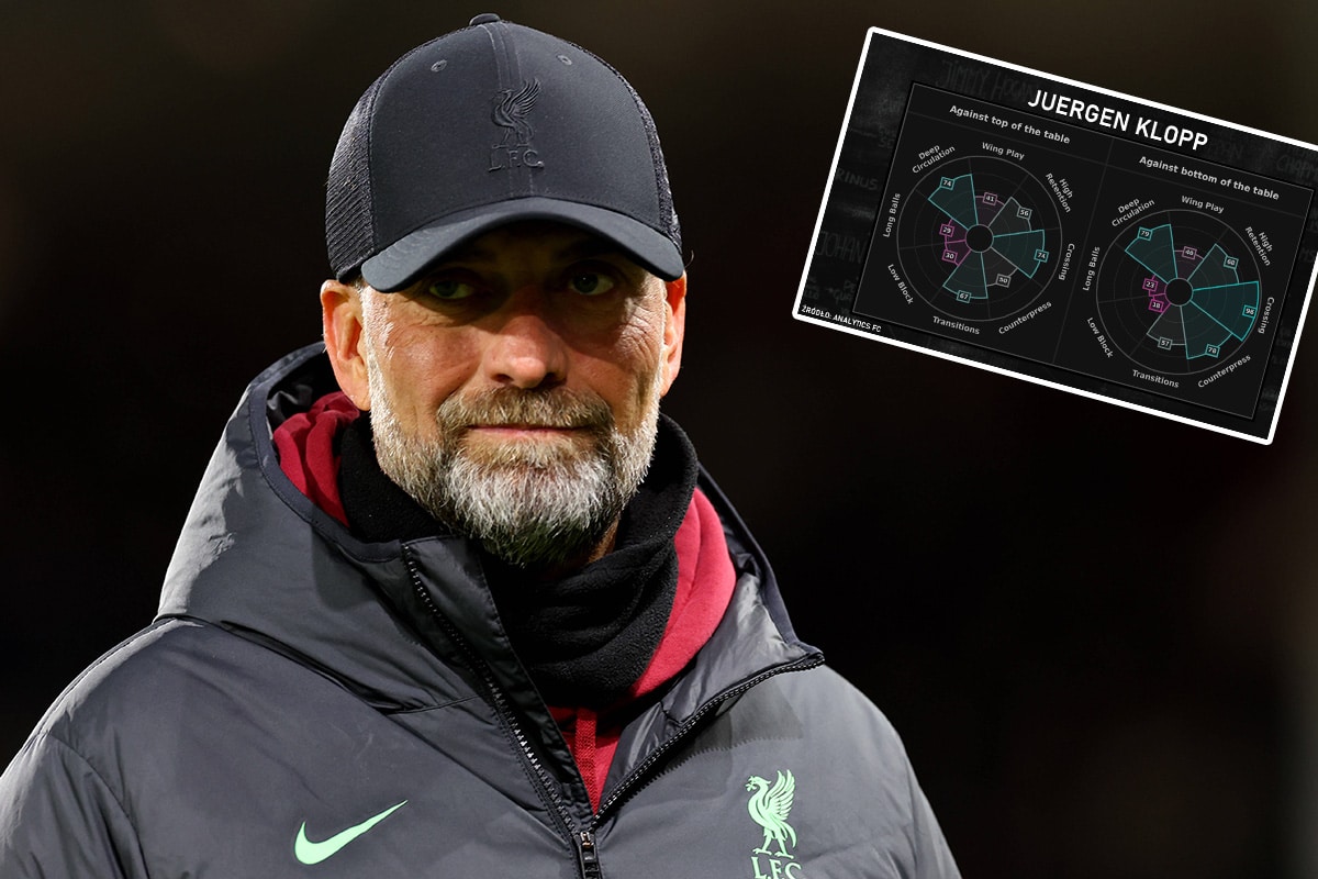 Analytics FC dzielą charakterystykę stylu gry na osiem cech stanowiących o tym, jak drużyna sprawuje się na boisku. Na poniższej grafice widzimy również rozgraniczenie w rywalizacji przeciwko drużynom równie silnym, jak i słabszym. Różnice są niewielkie, jedynie w nacisku na kontrpressing i fazy przejściowe, które wynikają po prostu z jakości przeciwnika i przestrzeni jaką może dysponować jego zespół. Udział w grze Liverpoolu przeciwko rywalom z czołówki bywa mniejszy, więc mają więcej okazji do ataków szybkich, niż z przeciwnikami broniącymi blisko własnej bramki. To nakładanie wyników innych trenerów na taką charakterystykę może dać Liverpoolowi większą jasność przy wyborze następcy, niż przeglądanie Wikipedii w celu sprawdzenia gablot kandydatów lub odsetka wygrywanych spotkań.