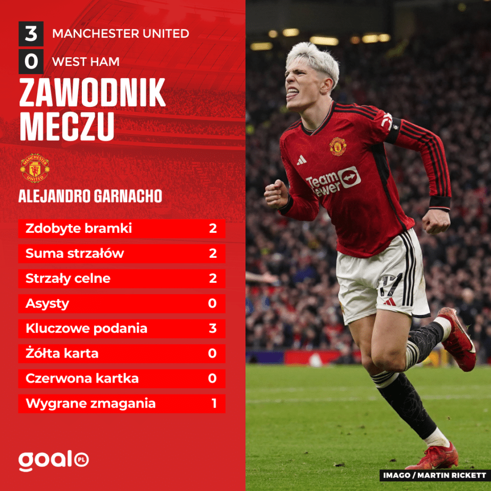 Manchester United podejmował na własnym stadionie West Ham w ramach 23. kolejki Premier League. Podopieczni Erika ten Haga odnieśli przekonujące zwycięstwo 3-0 przed własną publicznością. Bohaterem spotkania był Alejandro Garnacho, który został wybrany zawodnikiem meczu.