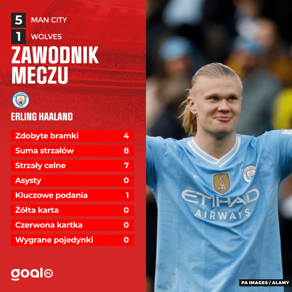 Łącznie na koncie norweskiego napastnika zapisano już 25 goli w Premier League. Dzisiejsze cztery trafienia przybliżyły go do zdobycia tytułu najlepszego strzelca w lidze. Od drugiego w tej klasyfikacji Cole Palmera ma aż pięć goli więcej. Warto zaznaczyć, że w tym momencie Haaland dla Manchesteru City łącznie strzelił 88 goli w dwóch sezonach. Dla porównania w trzech sezonach w barwach Borussii Dortmund zaliczył 86 trafień.