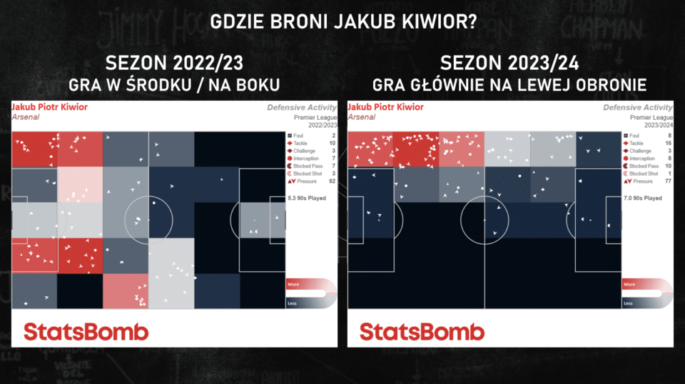 Do takich sytuacji musi się Kiwior przyzwyczaić. Jest znacznie częściej wystawiany na próbę niż grając na środku obrony, ale jego skuteczność interwencji w sytuacjach jeden na jeden w defensywie jest bardzo wysoka. Według StatsBomb wynosi 84% i sprawia, że jest w pięciu procentach najlepszych bocznych obrońców najlepszych lig europejskich. W Anglii radzi sobie dobrze – w ostatnich trzech meczach wygrał 6 z 8 takich pojedynków – ale w Lidze Mistrzów jest słabiej. Jesienią zagrał też z PSV na boku obrony i żadna z czterech prób nie była udana.