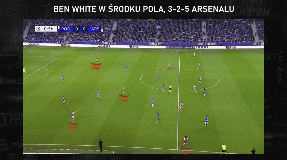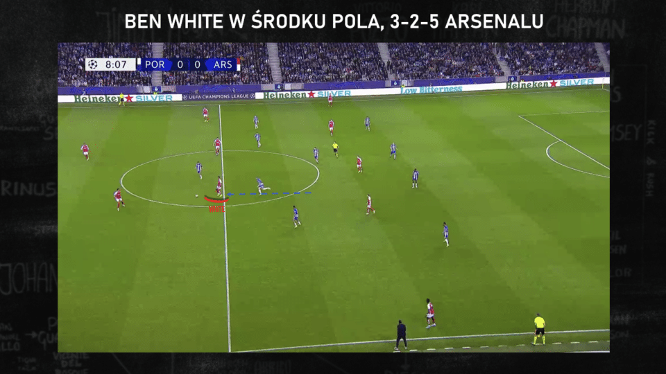 To jednak oznaczało, że 4-2-4 z wygranej przeciwko Liverpoolowi już ustąpiło miejsca typowemu dla „wychowanków Guardioli” ustawieniu 3-2-5 w rozegraniu ataku pozycyjnego. Jest to doskonale widoczne na poniższej grafice z sytuacją z meczu w Porto. Wreszcie udało się Arsenalowi „zbudować” na boisku to ustawienie, ale przy próbie rozegrania White popełnił błąd: schodząc do środka ustawił się tyłem do bramki przeciwnika. To był dla pomocników Porto sygnał, by doskoczyć pressingiem i szukać możliwości kontry. Tym razem skończyło się na faulu, ale schemat się powtarzał. Nawet jeśli White lepiej czuje się w tej roli niż Kiwior, to nie znaczy, że tak dobrze jak Zinczenko. W końcu droga Ukraińca do tego wiodła od ataku, odnajdywania się na małych przestrzeniach, a nie z rozgrywania, gdy cała drużyna przeciwna jest przed tobą.