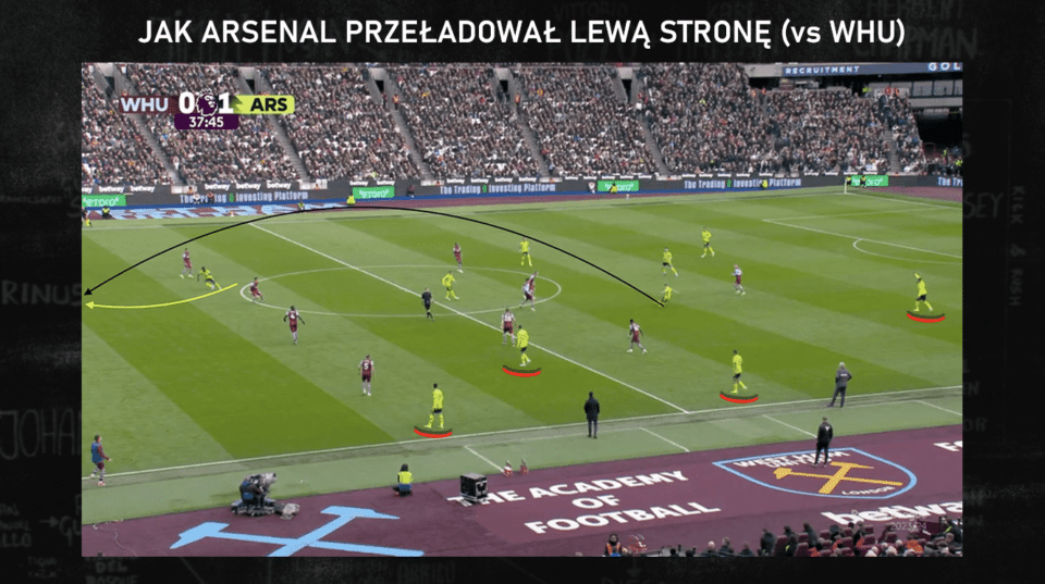 Na powyższym obrazku widać również, że ustawienie trójki obrońców jest specyficzne. Kiwior tak naprawdę nie schodzi do klasycznej linii z Gabrielem i Salibą, lecz zostaje bliżej lewej strony. Jednak Arsenal ma w zwyczaju „przeładowywanie” jednej flanki, by korzystać z przestrzeni na drugiej. Skupiają uwagę przeciwnika, a dzięki temu w sytuacji jeden na jednego z bocznym obrońcą jest Bukayo Saka. Skrzydłowy może to wykorzystać na różne sposoby: dryblingiem lub wbiegnięciem za linię wolne pole i długie podanie. Tak było z West Hamem, zresztą poniższa sytuacja (przed rzutem karnym na 2:0) obrazuje doskonale także to „przeładowanie”. Jest czterech piłkarzy Arsenalu w odległości nie większej niż 20 metrów od lewej linii bocznej, gdy po drugiej stronie nie ma nikogo na nawet większej przestrzeni.