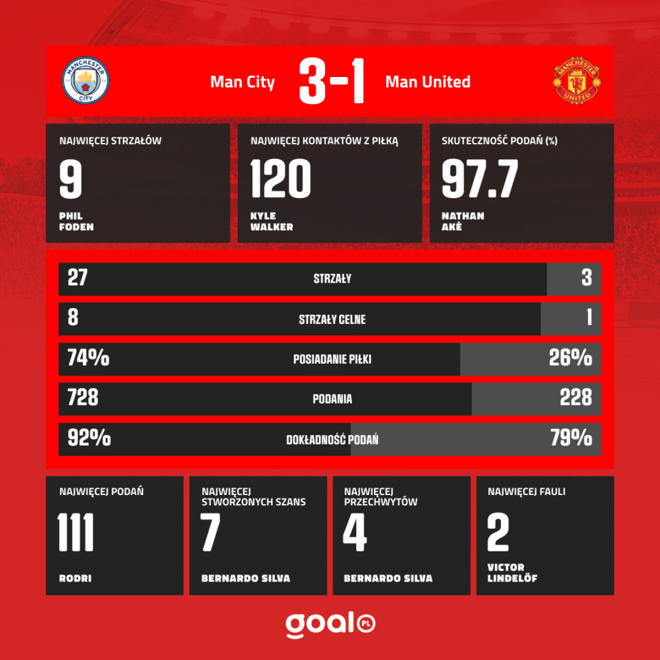 Choć to Manchester United za sprawą wspaniałej bramki Rashforda prowadził do przerwy 1:0, to w drugiej połowie błyskiem geniuszu popisał się Phil Foden. Najpierw wspaniałym strzałem z dystansu wyrównał wynik spotkania. Następnie w 80. minucie gry wykorzystał podanie w polu karnym i bez problemów pokonał Andre Onanę.
