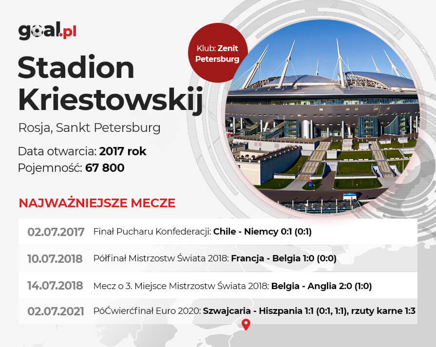 Rosja zyskała więcej spotkań, po tym, jak w kwietniu 2021 r. prawo organizacji Euro straciły obiekty w Bilbao i Dublinie, gdzie swoje mecze miała rozgrywać reprezentacja Polski. Tym samym Biało-Czerwoni w dwóch spotkaniach grupy E wystąpili właśnie na obiekcie Kriestowskij i rywalizowali tam ze Słowacją (0:1) i Szwecją (2:3). Ponadto na mistrzostwach Europy 2021 w piłce nożnej w Sankt Petersburgu grały drużyny z grupy B, a w dwóch spotkaniach na własnej murawie zaprezentowali się Rosjanie. W Sankt Petersburgu odbyło się również jedno spotkanie ćwierćfinałowe Euro 2020. Hiszpania po rzutach karnych wygrała ze Szwajcarią 3:1. W regulaminowym czasie gry i po dogrywce był remis 1:1.